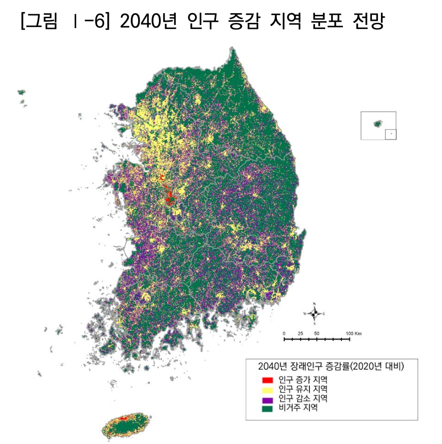 농어촌 및 지방중소도시의 인구감소와 고령화가 현저하게 진행되고 있습니다. 앞선 "2040년 인구 증감 지역 분포 전망" 그래프에서 살펴본 바와 같이 농어촌으로 갈수록 인구 감소가 더 급격하게 진행되리라 예측하기도 합니다. 알고는 있었지만 이렇게 수치해서보니 우리나라 국토도 적은데 수도권 쏠림현상이 심하긴 하네요.