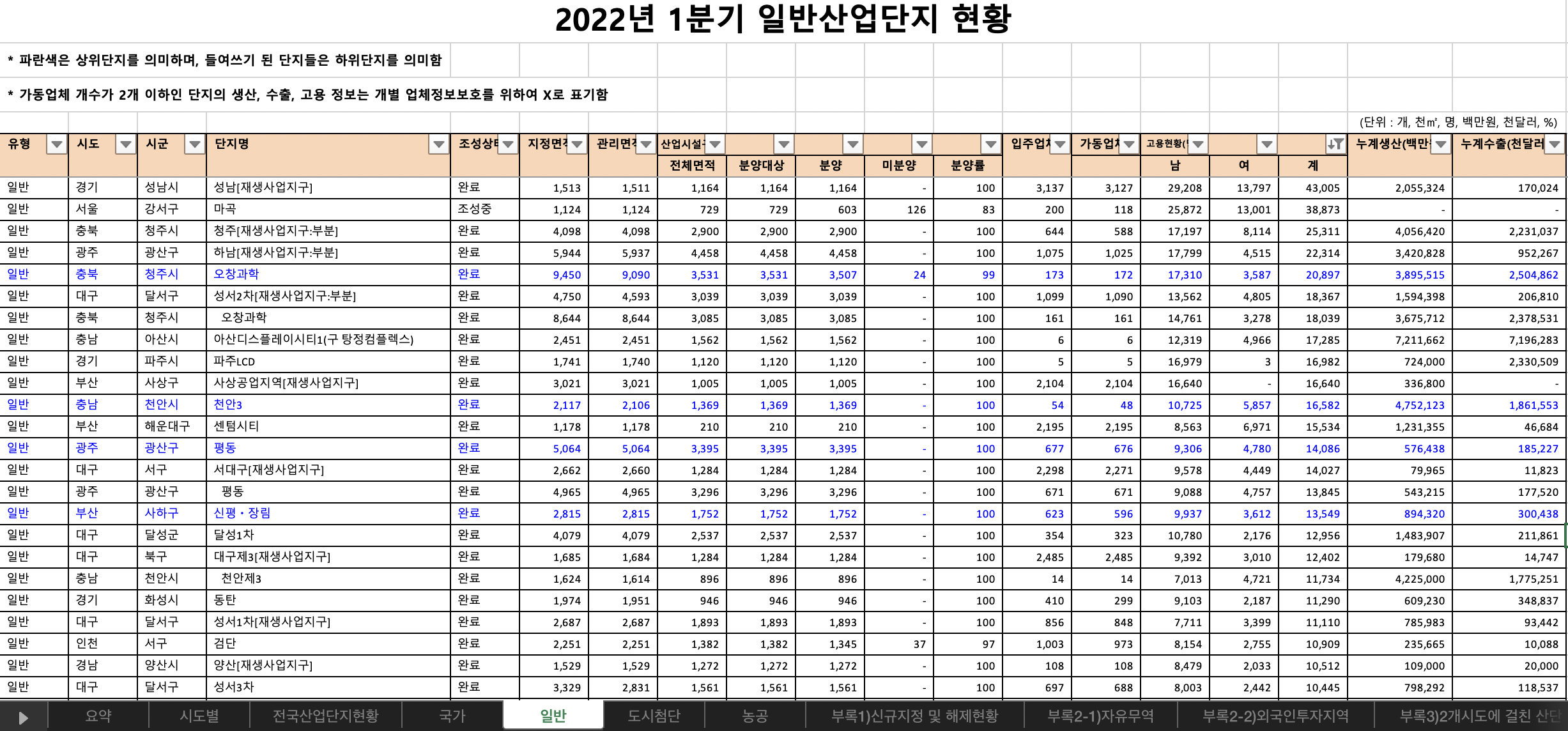 이제 다운로드한 파일을 열어봅니다. 2022년 1분기 전국산업단지 현황통계에 대한 내용이 보입니다. 하단의 붉은 박스를 보시면 "요약", "시도별", "전국산업단지현황", "국가", "일반", "도시첨단", "농공", ...등의 많은 시트가 존재하는 것을 알 수 있습니다. 이 많은 시트를 다 보실 필요는 없습니다. 여기서 중요한 몇 가지 시트만 알아보기로 합니다.