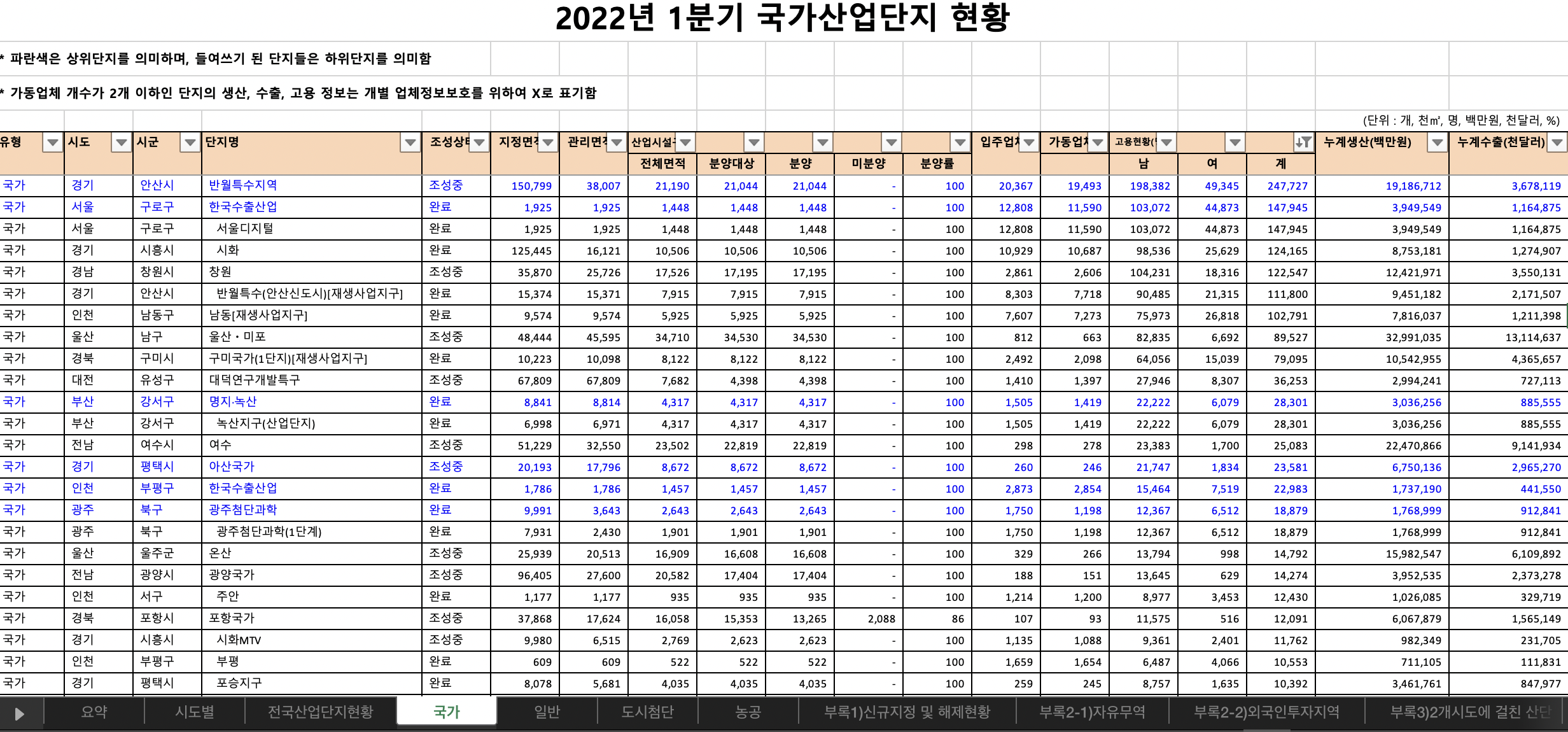 "국가"시트를 클릭하고, "고용현황(Q)"열을 중심으로 내림차순 정렬을 했습니다. 파란색 글자는상위단지이고, 들여쓰기 된 단지는 하위단지입니다. 하위단지 여러개가 모여서 상위단지를 형성합니다. 여러 단지가 모여있다는 의미지요.