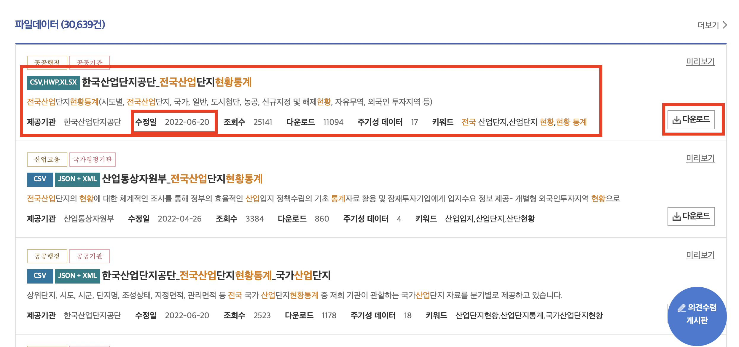 결과가 상당히 많이 나오는데요, 모든 데이터를 하나하나 다 볼 수는 없으니 적당히 관련있어보이는 "한국산업단지공단" 에서 발간한 자료를 다운로드 합니다. 수정일이 가장 최근이기 때문에 "산업통상자원부"의 데이터보다는 좀 더 최신성이 있어서 좋아보입니다.
