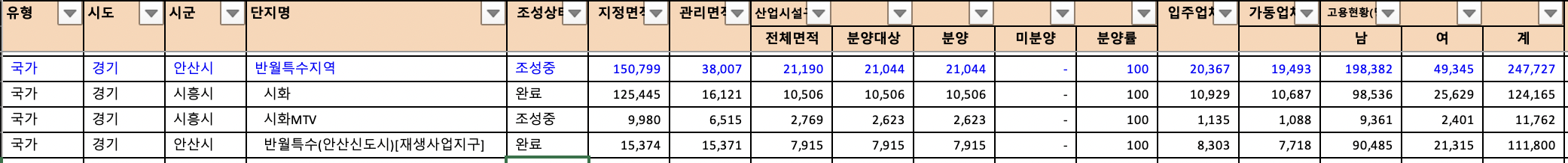 고용현황이 가장 높은 상위단지이면서, 고용현황이 높은 하위단지를 품고 있는 경기 안산 반월특수지역입니다. 시화MTV지구는 조성중이지만 고용현황이 그리 높지는 않기 때문에 시화단지, 반월특수단지(안산신도시)를 눈여겨보면 좋을 것 같습니다.