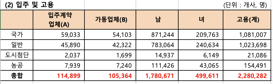 입주 및 고용 측면에서도 분석해보겠습니다. 사실 산업단지 근처의 수요를 파악하려면 "고용명수"가 얼마나 되느냐가 가장 중요합니다. 고용이 늘어날수록 인근 부동산 수요가 증가하는 셈이니까요. "국가산업단지"와 "일반산업단지"의 고용이 가장 많고, 둘 간의 유의미한 차이는 보이지 않습니다.